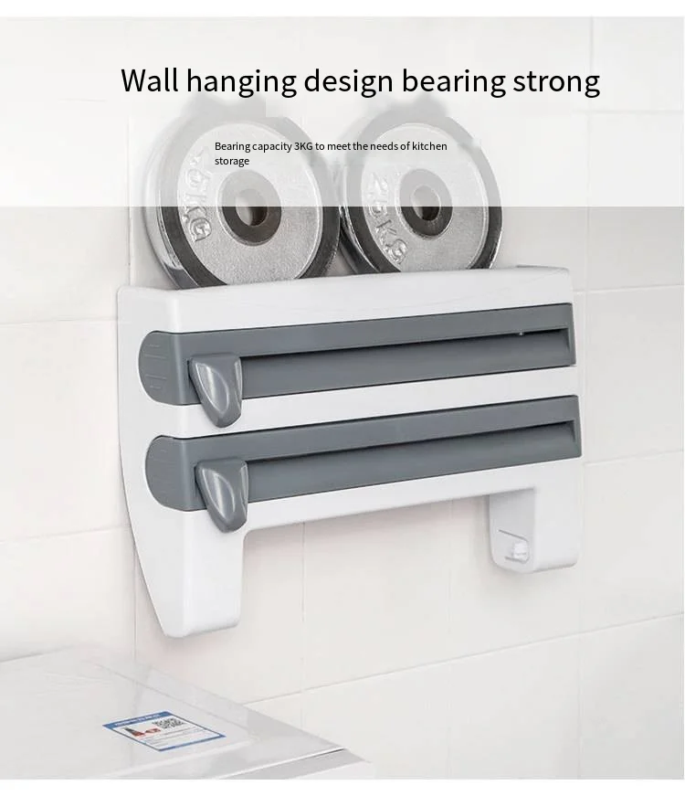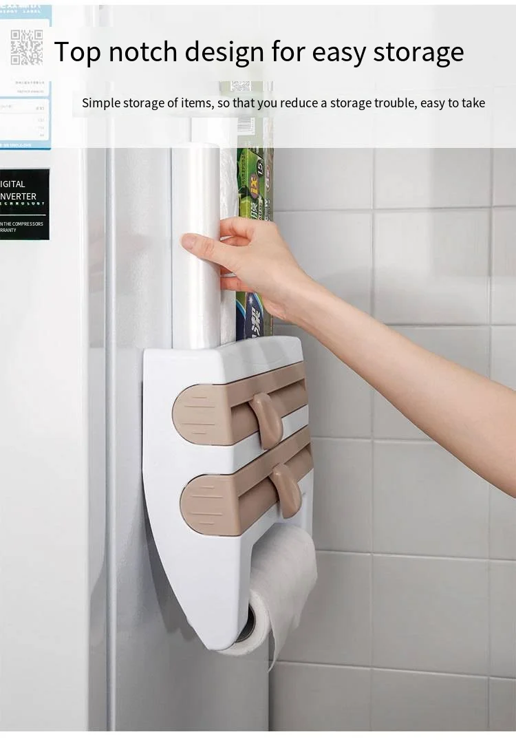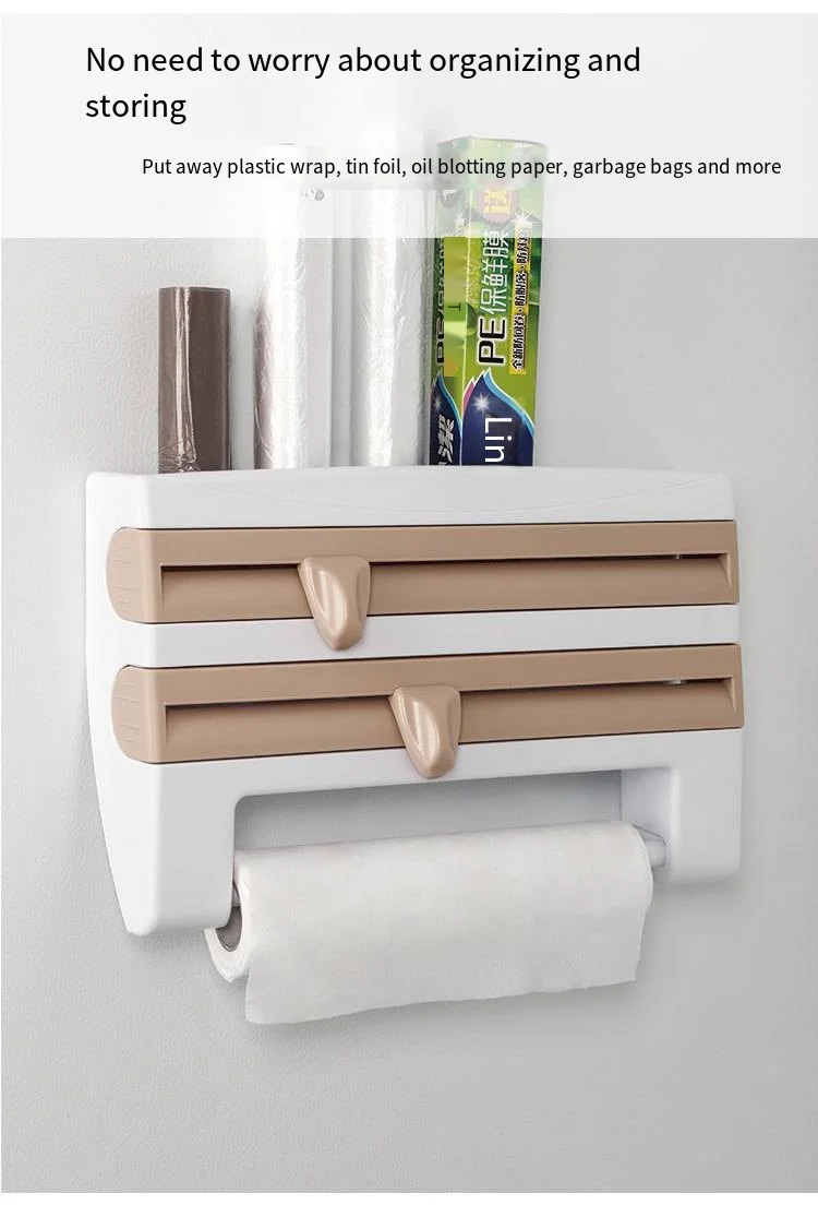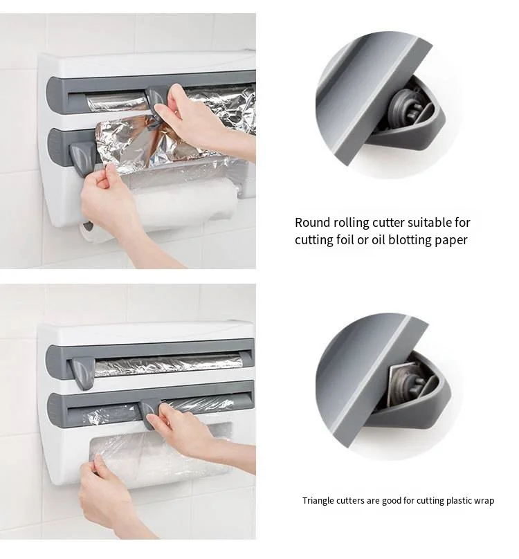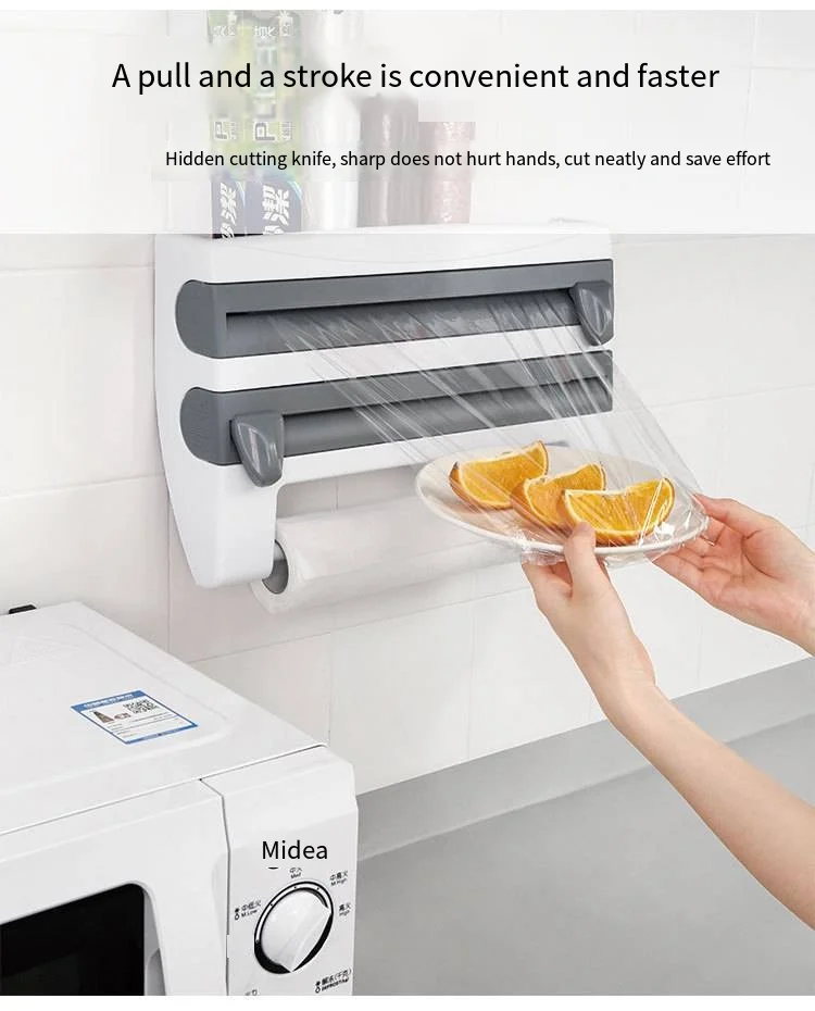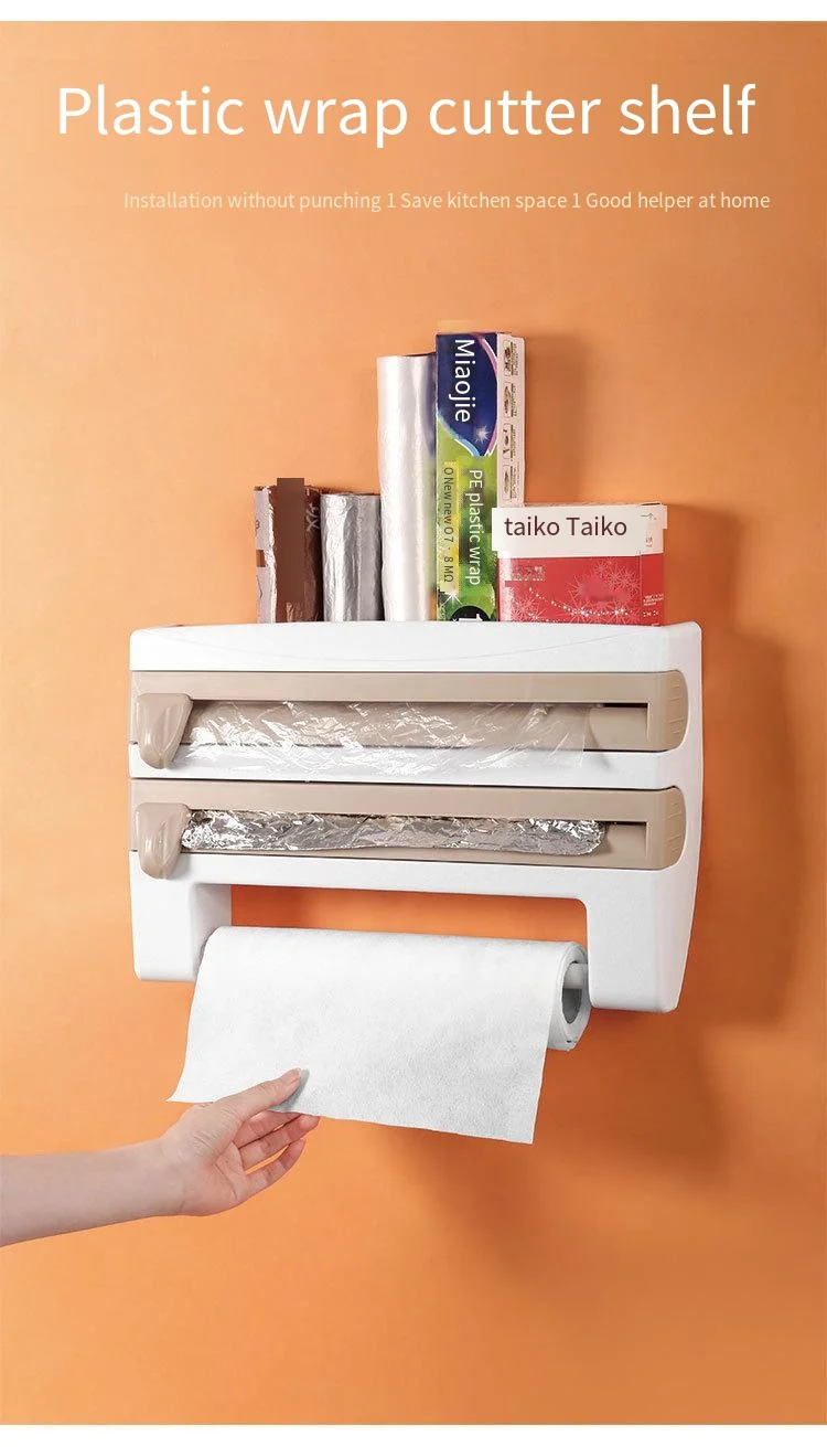 Paper Towel Foil Kitchen Wrap Dispenser Wall Mounted 4 in 1 Cling Film Roll Holder Cutter With Spice Storage Rack