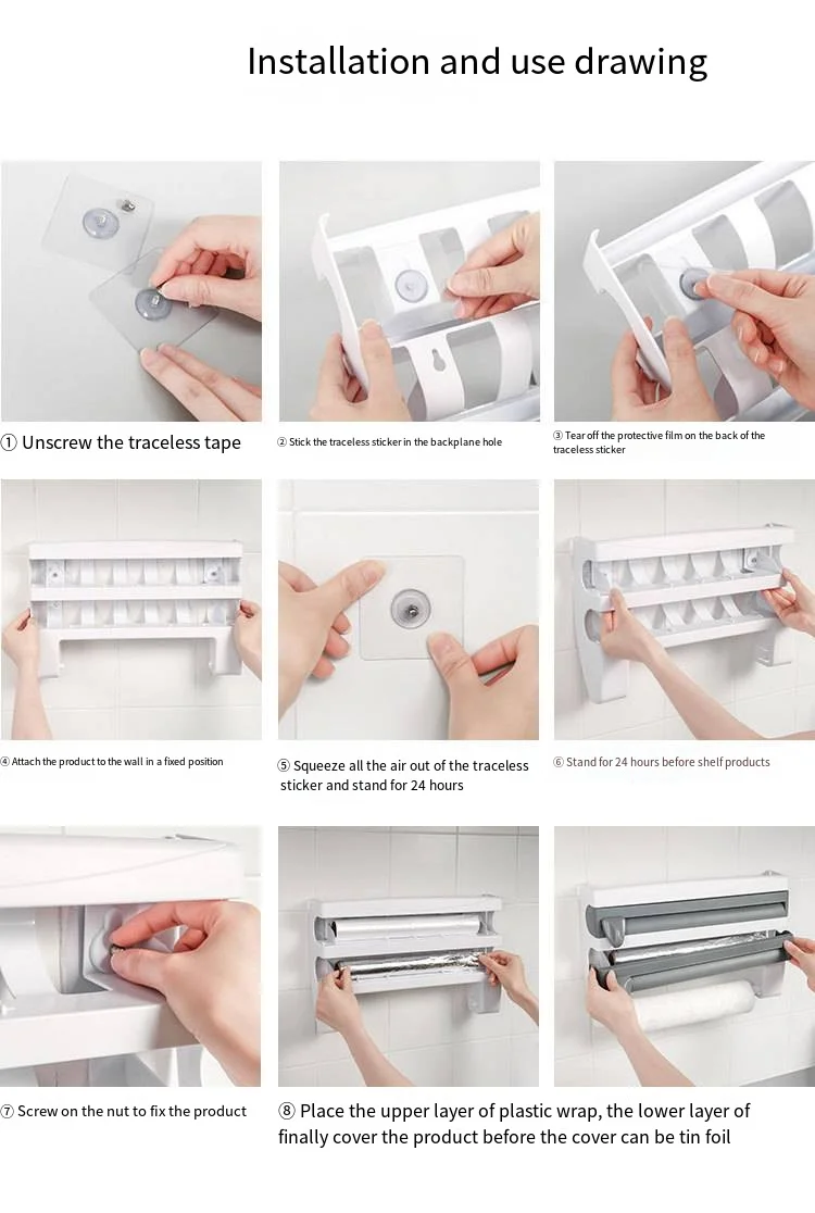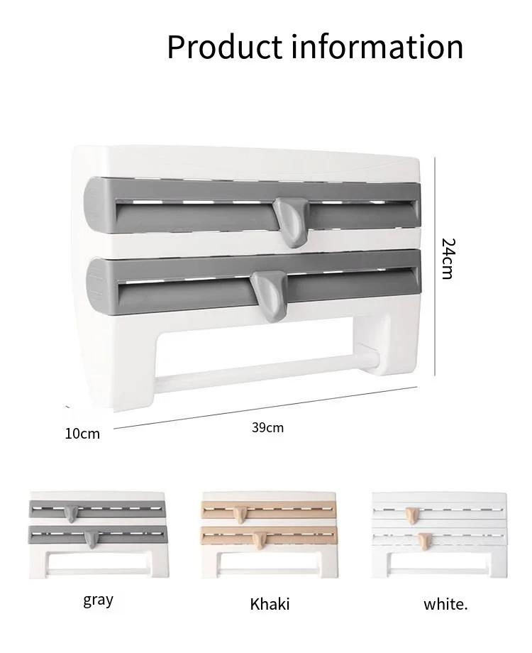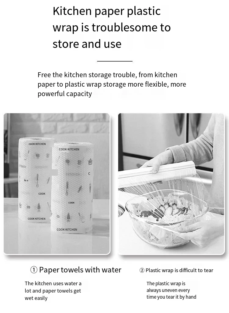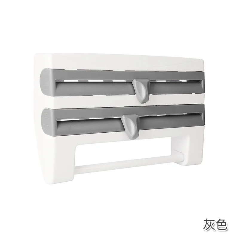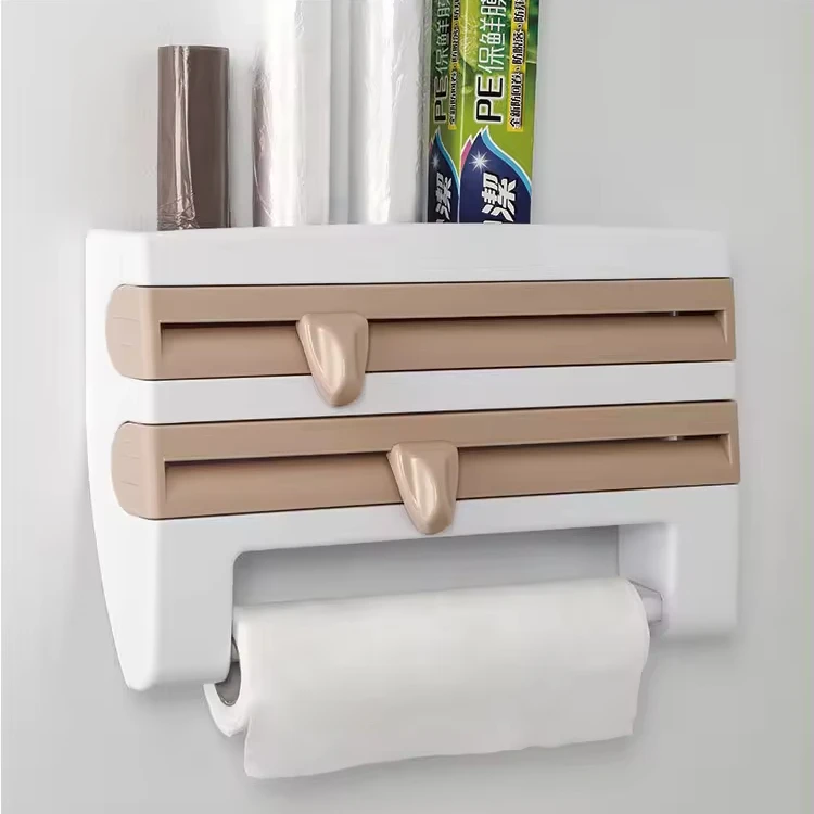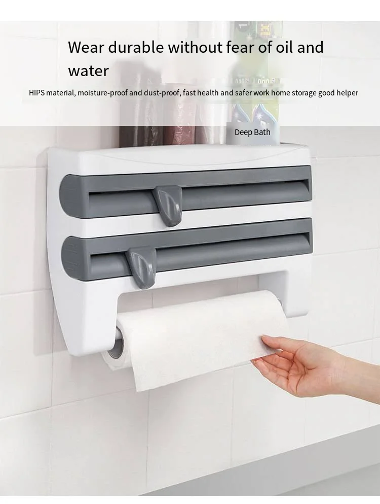 Paper Towel Foil Kitchen Wrap Dispenser Wall Mounted 4 in 1 Cling Film Roll Holder Cutter With Spice Storage Rack